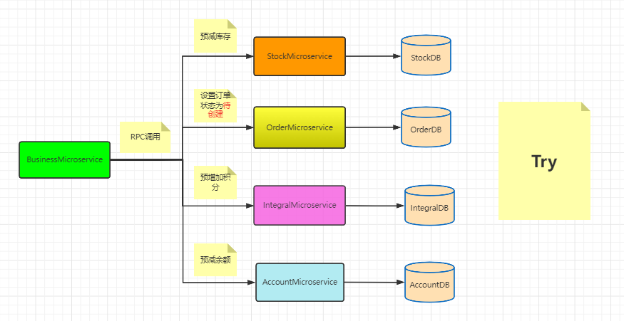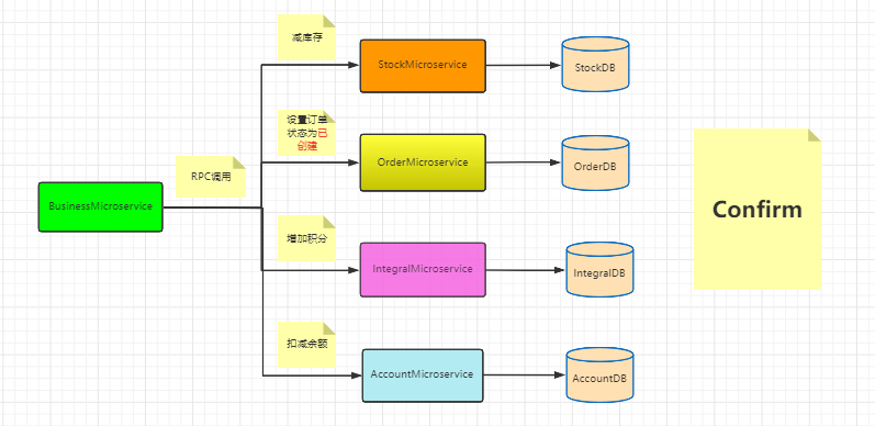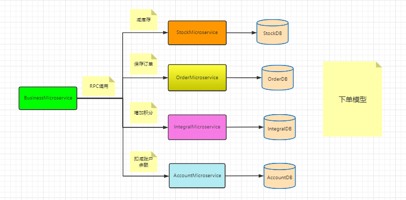 的工作机制,正常的下单会包含创建订单,扣减库存,扣减账户余额,增加积分等功能,所以会调用这些子系统, 有的系统使用http进行远程调用,有的使用rpc进行调用,我们这个例子中有五个微服务,分别为业务微服务(BusinessMicroservice)
