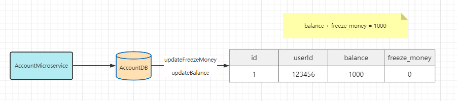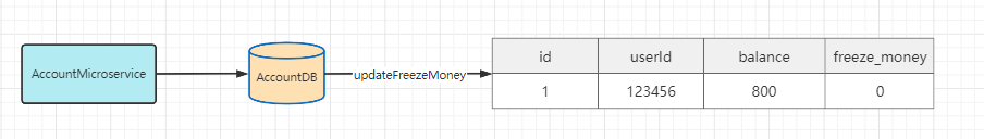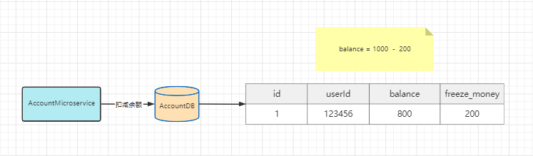 扣减余额我们在账户表中添加一个冻结字段,例如,如果账户余额为1000,本次需要扣减200,那么此时余额就变为800(1000-200), 冻结金额为200。