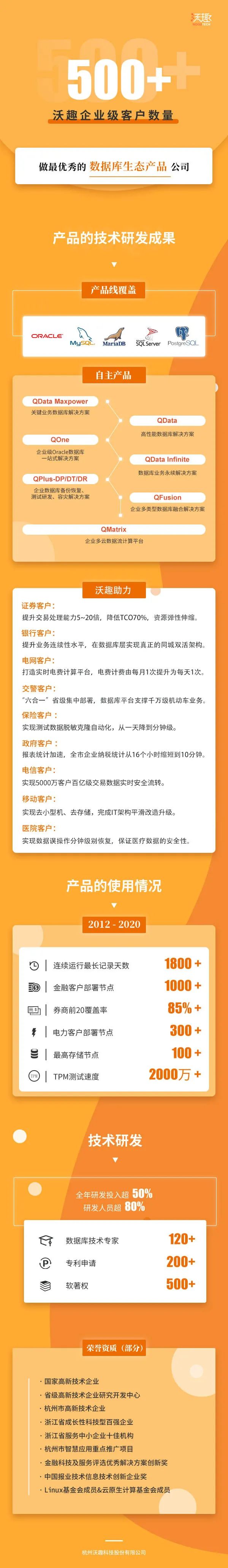 勇猛精进,在时代的趋势中,做出最好的数据库平台产品感谢一直以来支持沃趣信任、沃趣的朋友。作为国内首家数据库一体机厂家,沃趣一直专注在产品研发,集中资源希望能够为用户带来最好的数据库技术和使用体验,优秀的产品是沃趣的立足之本,也很骄傲我们的产品已广泛应用于各行业各,累计服务用户数量已超过500家。