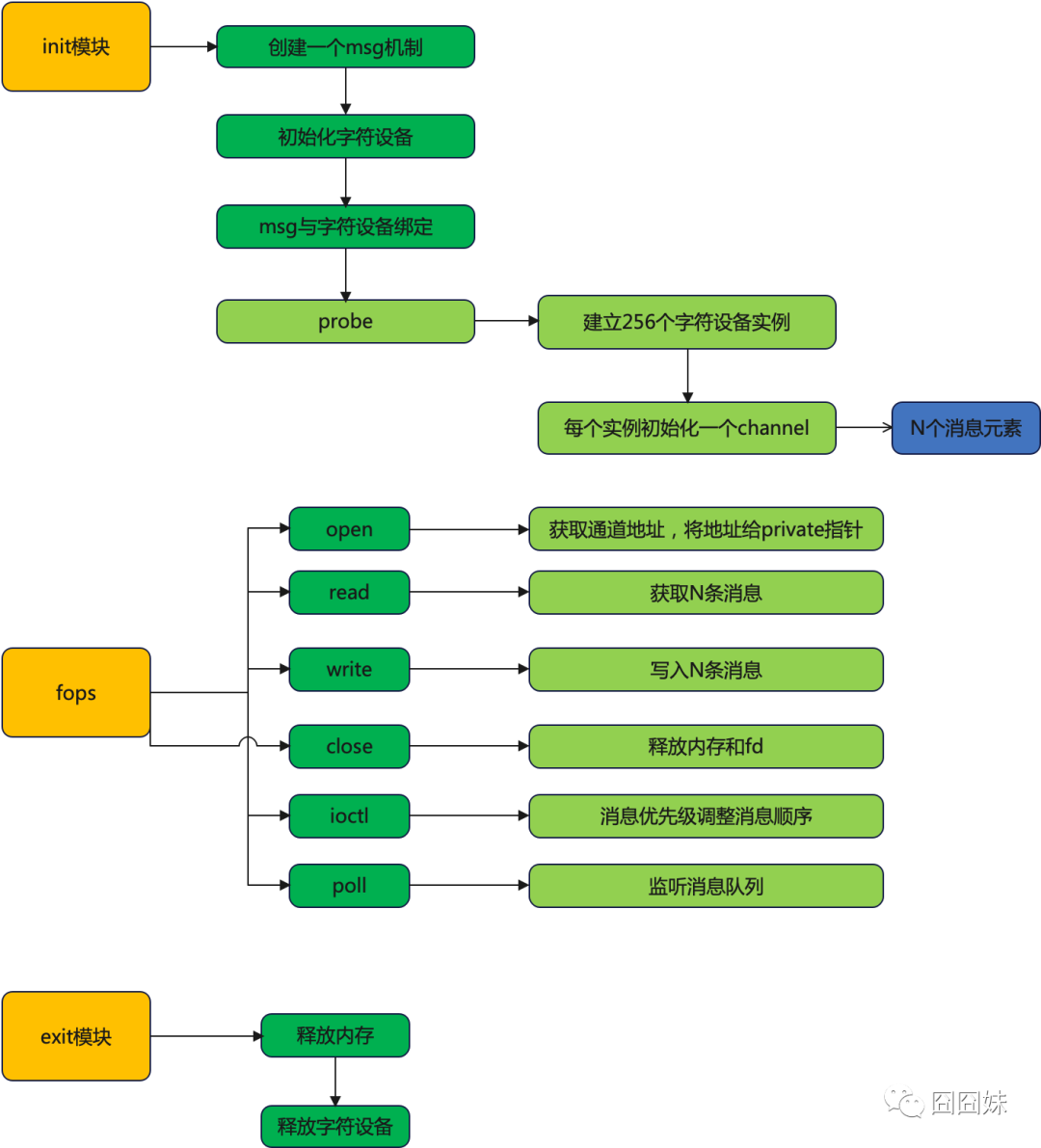 我们的构思大概是这样的,后面也可能会大幅度来调整,我们创建一个全局的设备类,该设备类下创建256个字符设备,每个字符设备我们绑定一个channel,channel下面可以放n个消息元素。