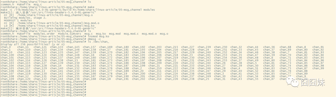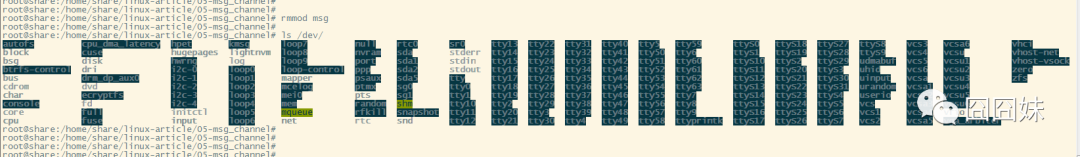 /** @brief msg_init* 模块初始化函数* @param* @param* @return 0-成功;其它错误码* @discri* @note*/static int __init msg_init(void){u32 ret = 0;//申请一个全局chanpcalloc(get_globalchan(chan), sizeof(chan_st), chan_st);//申请一个字符设备ret = alloc_chrdev_region(&get_globalchan(chan)->devno, 0, CHANNEL_MAX, CHANNEL_NAME);if(ret != 0){ pfree(get_globalchan(chan)); get_globalchan(chan) = nil; return ret; } //释放pchando{//初始化cdev_init(&(get_globalchan(chan)->cdev), &chan_fops);//添加到内核ret = cdev_add(&(get_globalchan(chan)->cdev), get_globalchan(chan)->devno, CHANNEL_MAX);if(ret < 0){ cdev_del(&(get_globalchan(chan)->cdev)); break; }get_globalchan(chan)->dev_class = class_create(THIS_MODULE, CHANNEL_NAME);if(IS_ERR(get_globalchan(chan)->dev_class)){kernel_print(KERN_ERR "Unable create sysfs class for demo\n");ret = PTR_ERR(get_globalchan(chan)->dev_class);break;}//将所有字符设备创建出来chan_create();return 0;}while(0);unregister_chrdev_region(get_globalchan(chan)->devno, CHANNEL_MAX);pfree(get_globalchan(chan));get_globalchan(chan) = nil;return -1;}