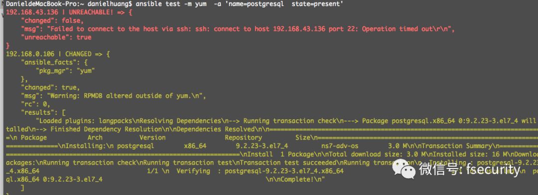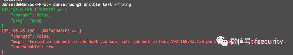 ansible “192.168.0.105” -m ping #针对单台机器192.168.0.105执行ping,测试被管理机与管理机有没有正确建立通信# -m 模块名 表示调用ansible的某个模块,ansible weijiagu-group -m ping #针对weijiagu-weijia-group这个组里面的主机执行ping,测试被管理机与管理机有没有正确建立通信# -m 模块名 表示调用ansible的某个模块,