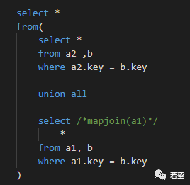 例如:表 a 跟表 b 进行 join 操作,有数据倾斜的表是 表a ,表 a 里边的倾斜的头部 key 非常少,只有 key = 1 的数据特别多,可以将 a 的数据分为两部分 a1 跟 a2,a1 中只包含 key = 1 的倾斜数据,a2 不包含数据倾斜的数据。采取 union all + mapjoin 的方式分而治之,把key = a 单独抽出来作为一组用 mapjoin ,剩下的另起炉灶直接用 join,最后再把各自计算得出来的结果用 union all 拼接起来。