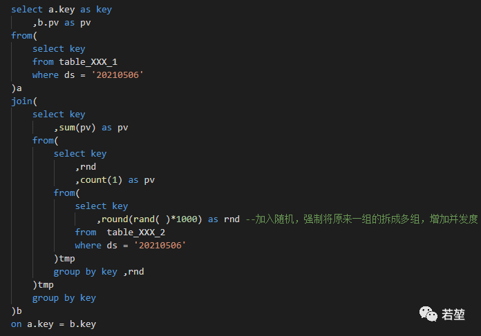 事前最好的办法是:写 SQL 操作之前,先简单看下表的数据量级,再看 key 的空值与无效值的统计,表与表之间的关联可以,先增加空值与无效值的过滤处理,比如直接去掉,或者在大表关联大表出现的异常值使用 rand 函数进行随机填充。