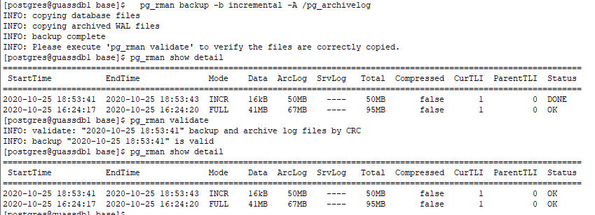 [postgres@guassdb1backup]$ pg_rman backup -b full -A pg_archivelog