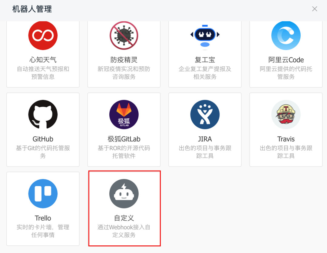 首先创建一个钉钉群,然后进入群设置,找到智能群助手,点击【添加机器人】,找到【自定义】,如图: