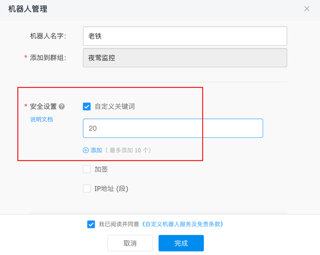 自定义关键字里写“20”,啥意思呢?就是说,这个钉钉机器人提供了一个webhook url地址,夜莺发消息的时候就调用这个url,但是,钉钉为了安全考虑,不能让发送方随随便便就发送,自定义了一个关键字“20”,这就需要夜莺发给钉钉的消息每次都必须带上“20”这个关键字,否则钉钉就拒收了。