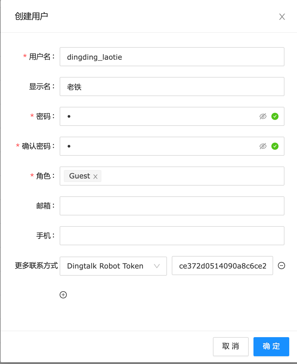 在用户管理页面,以管理员身份创建一个用户,把刚才记录的token填入更多联系方式中的Dingtalk Robot Token中,如下: