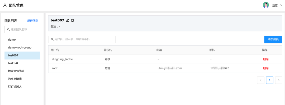夜莺v5版本,告警只能发给团队,不能发给个人,所以要想收告警,必须要先有一个团队,比如下面,我们创建了一个test007的团队,而且把刚才创建的dingding_laotie账号添加到了这个团队中了: