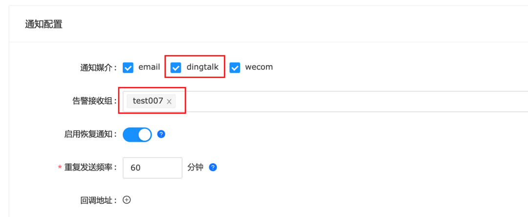 要勾选通知媒介中的dingtalk,告警接收组设置为刚才创建的test007。