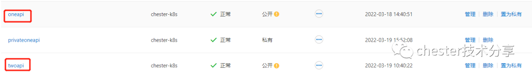 apiVersion: apps/v1kind: Deploymentmetadata:name: chesterdeploymentnamespace: chesternslabels:app: chesterapispec:replicas: 3selector:matchLabels:app: chesterapitemplate:metadata:labels:app: chesterapispec:containers:- name: oneapiimage: registry.cn-beijing.aliyuncs.com/chester-k8s/oneapi:latestports:- containerPort: 5000livenessProbe:httpGet:path: /testport: 5000- name: twoapiimage: registry.cn-beijing.aliyuncs.com/chester-k8s/twoapi:latestports:- containerPort: 5001livenessProbe:httpGet:path: /test/calloneapiport: 5001