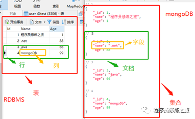 具体的数据库安装就不在介绍了,网上一搜一大推。MongoDb采用BJON化的文档存储,所以其基本结构概念可以结合JSON联想一下:字段、文档、集合、数据库,这和RDBMS的属性、列、表、数据库是一一对应关系。下面以一个表格来对比说明一下: