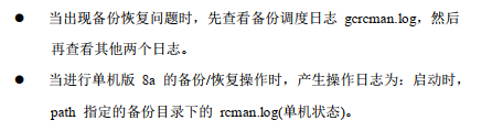 | 备份恢复日志 | $GLUSTER_BASE/log/gcluster/rcman.l og | 集群每个 Safegroup 中被选来 进行数据备份或恢复的节点(一 般为组内第一个节点,或是有备 份数据的节点)有此日志 |