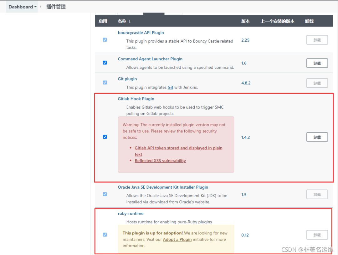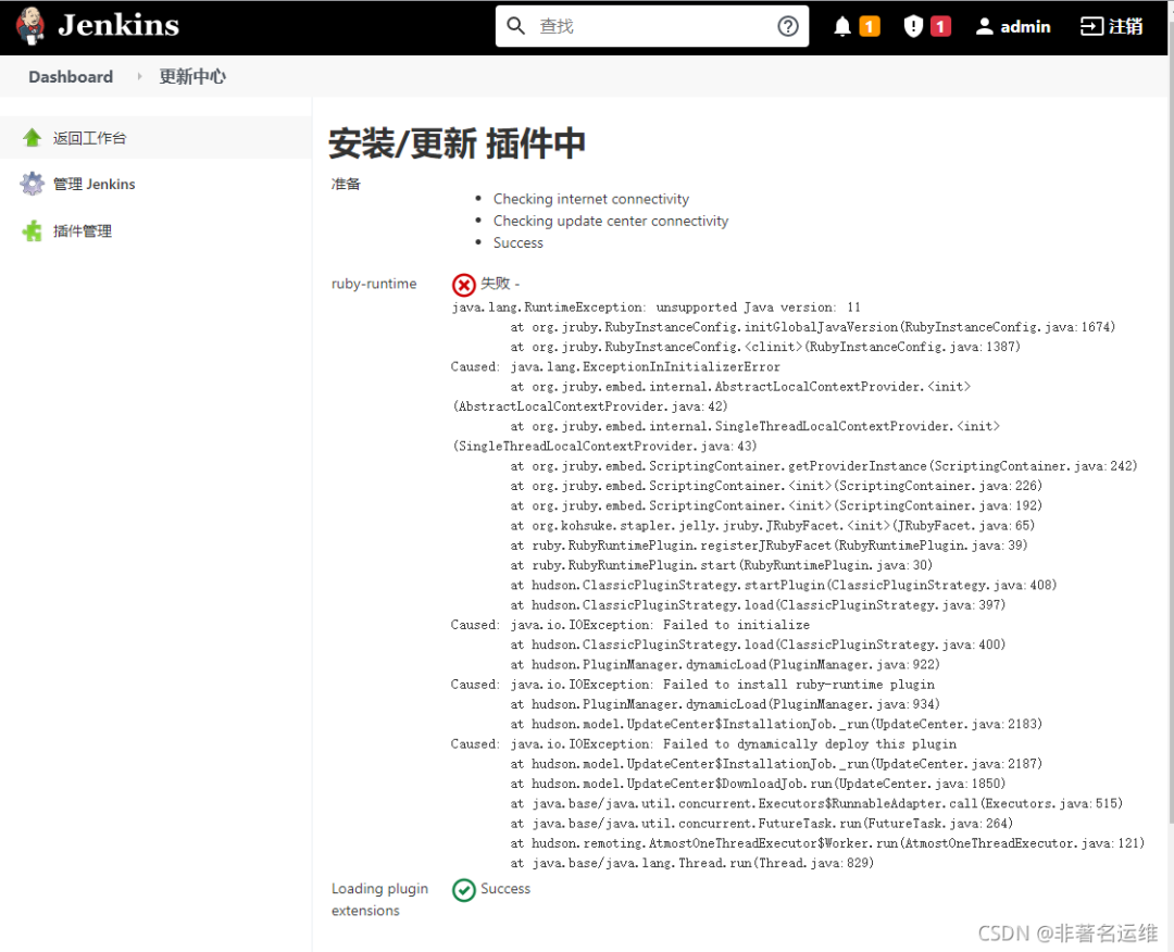 再次安装ruby-runtime插件,若还是失败,可以在Jenkins首页重启一下再安装即可。(重启Jenkins后ruby-runtime插件默认就会加载成功)