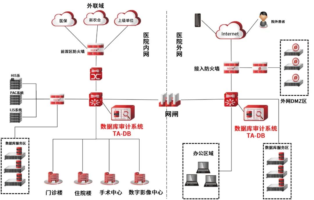 对于某三甲医院客户的网络现状而言,医院互联网出口、内网外联域出口为关键网络安全边界。根据该医院的业务特点,客户的数据库类型复杂且数据流量大,内外网区域隔离,审计难度较高。