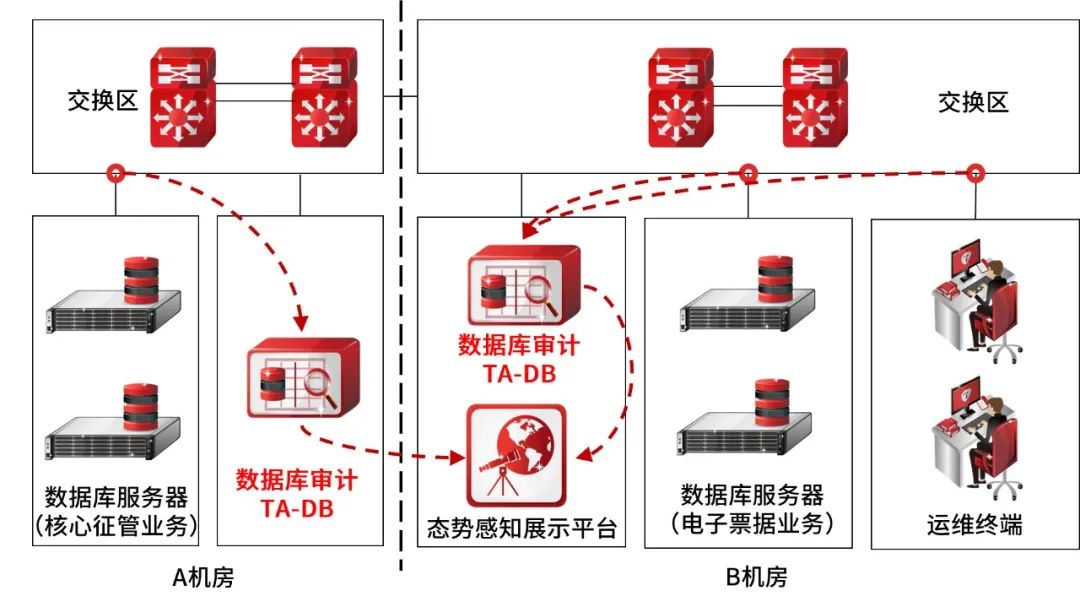 天融信数据库审计系统在该案例中,旁路部署30+个节点,采集核心征管、电子发票等关键业务流程,深度挖掘用户业务操作行为与运维数据库操作行为,结合资产对象、实际责任人,精确定位异常操作行为时间点、位置以及操作人。