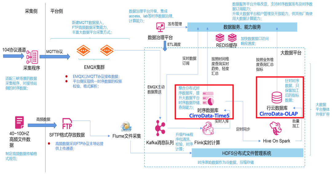 故障诊断与预警大数据平台主要采集风机数据、升压站数据、站控系统震动数据等生产数据,采用标准工业协议104进行采集。对于风机震动这类高频数据,通过SFTP协议按照指定格式传送到服务器内,采用CirroData-TimeS分布式时序数据库对时序数据进行计算、存储。
