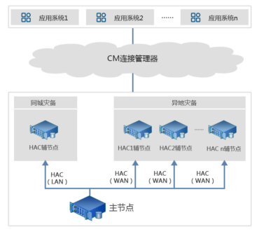 如图,在灾备集群中,PRIMARY为主节点,HAC为辅节点;支持同城灾备集群和异地灾备集群。异地灾备集群支持多个节点、部署距离更远、对网络带宽要求更低;连接管理器(CM)可部署在一个或多个数据节点上,建议部署在单独的应用服务器或服务器集群上。
