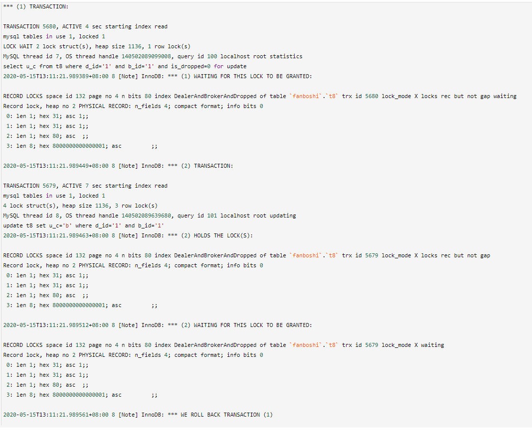 | update t8 set u_c='b' where d_id='1' and b_id='1'; —此时触发死锁 S2回滚 |