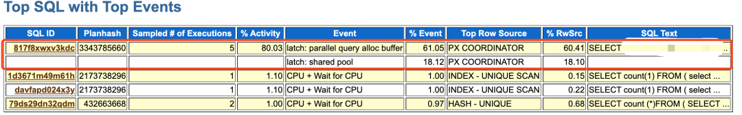 分析问题时间段的ash报告,817f8xwxv3kdc这条sql对应的是相关的并行等待事件。对语句进程排查未在语句中发现hint相关的并行。全库数据库对象上也未开启并行度。难道是在会话级别开启了并行?