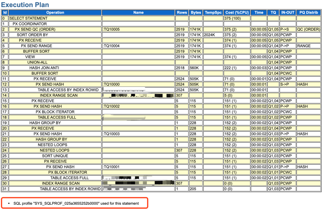 查看817f8xwxv3kdc该语句的历史执行计划,执行步骤确实存在并行。最重要的是底部有SQLprofile信息,说明该语句绑定了执行计划,而且这个sqlprofile是SYS开头的,基本可以确定是通过DBMS_SQLTUNE包跑出来的SQLproile,随后直接accept的。