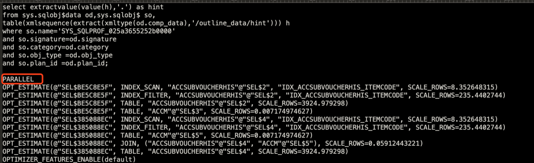 该SQLprofile的内容中(如下图),指定了paralellel,但未执行并行度,也就是说根据当前负载自动决定并行度。