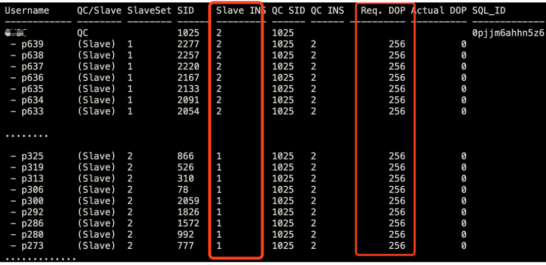 在随后的会话监控中也抓到了此类语句并行运行情况,并行度256并且是跨节点的2个slaveset。此类语句并行多跑几个,总进程基本就会跑满。