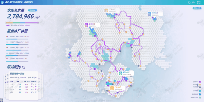 HT 通过搭载数据采集设备、水质检测传感器、压力传感器、智能水表、流量计等设备,对水务信息进行实时动态采集,重点关注各水厂、水量、泵站的压力、流量、转速等关键性指标。主页场景汇总各水库、水厂、泵站定位信息,用户可点击对应区域进行详细查看。