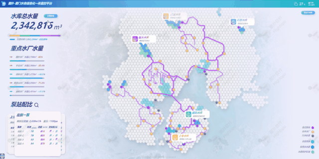 Hightopo 应用自主研发的 HT 产品,搭建了以厦门区域为载体的 2D 智慧水务可视化解决方案。界面摒弃了以往传统的地图模式,采用更加简洁的六边形色块拼接出湖泊水库等地形,河流分支则运用更加简化的线条予以展现,再选用不同颜色标明泵站、自来水厂、污水处理厂、非饮用水、饮用水水源及水源保护区域位置。如此设计更容易突出业务内容,让管理达到事半功倍的效果。