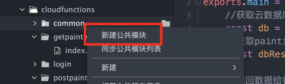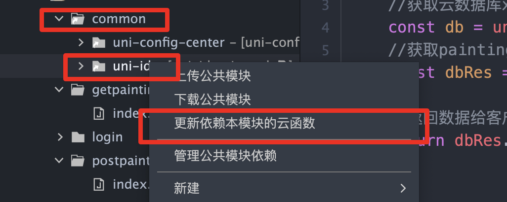 目录下的公共模块目录上单击鼠标右键选择更新依赖本模块的云函数