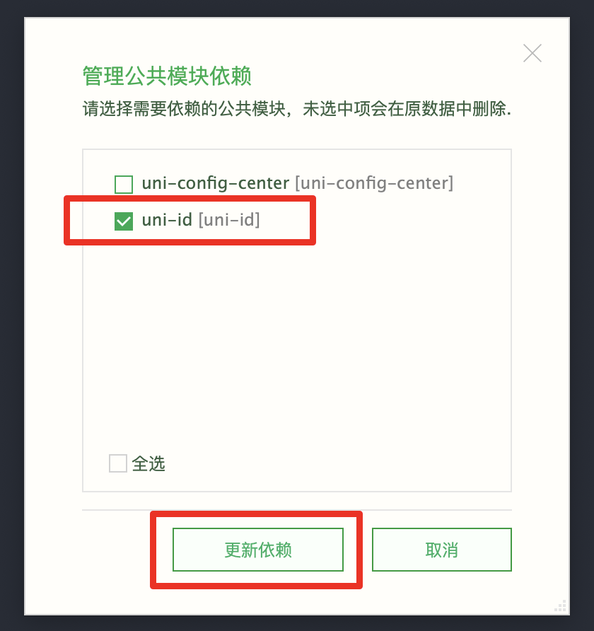 在要使用公共模块的云函数上单击鼠标右键选择管理功能模块依赖