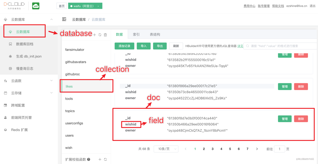 (表)。一个集合可以有多个记录doc