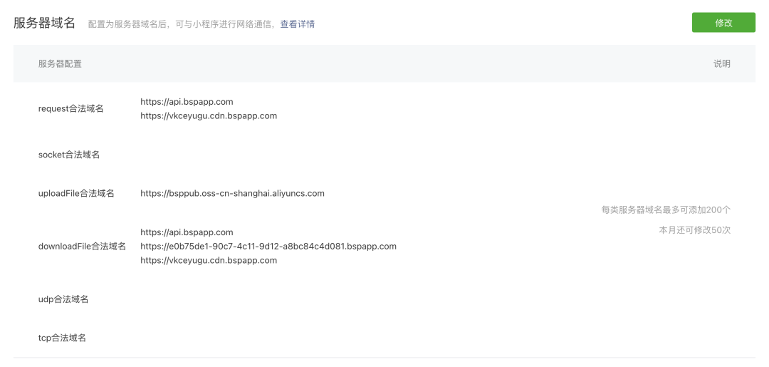 | 服务提供商 | request合法域名 | uploadFile合法域名 | download合法域名| |