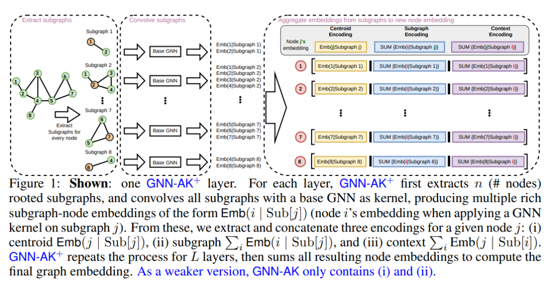 本文的工作介于这两种机制之间:作者引入了一个通用框架来提升 MPNN 以使其更具表现力,同时具有有限的可扩展性开销并大大提高了实际性能。作者通过将 MPNN 中的局部聚合从星型模式扩展到一般子图模式(例如,k-egonet)来实现这一点:在框架中,每个节点表示被计算为周围诱导子图的编码,而不是仅直接邻居的编码(即一个strar)。作者选择子图编码器作为 GNN(主要是 MPNN,考虑到可扩展性)来设计一个通用框架,用作提升任何 GNN 的encoder。本文将提出的方法称为 GNN-AK (GNN As Kernel),因为该框架类似于卷积神经网络,将内核替换为GNN。