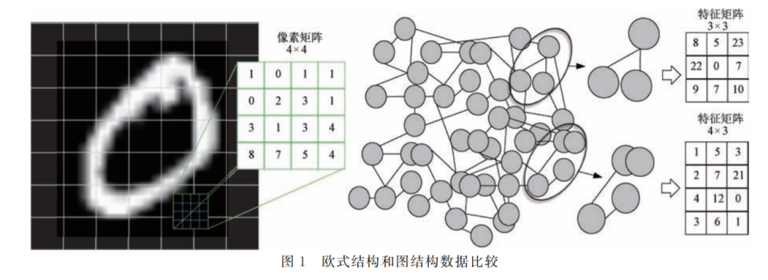 在数学表达上,这些数据与欧式结构数据相比,每一个区块的特征矩阵维度都不是统一的,如图1所示。由于无法使用统一规整的算子对数据编排,导致 CNN 等神经网络不能再直接对其进行诸如卷 积和池化等操作,也就不再有局部连接、权值共享、 特征抽象等性质[8]。如何将 CNN 等深度学习算法 用于分析图结构数据上成为一个有挑战性和前沿性的课题。