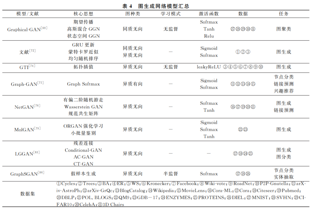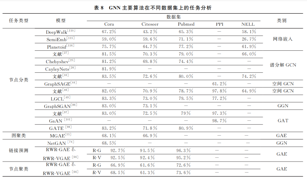 由于现实世界数据的复杂性,抽象出来的图结构也会有很多的种类和变体。有向无向、异质非异 质、带权不带权等等,大部分的GNN仅能处理其中的某一种类型。而更普遍的情况是各种各样的图混 杂在一起,并且希望 GNN 能满足诸如节点分类、图分类、可视化、图生成等多种任务需求。在这种复杂 的高强度的任务要求下,单一的神经网络作用过于 有限。因此对于更加复杂的情况,有必要进行多网络 融合.目前比较主流的多网络融合方式是GCN与其他GNN算法相结合。例如在节点属性和图拓扑结构信息的获取上,GCN 明显具有较高的性能和良 好的适应性,在节点分类问题上会表现良好.鉴于其 优点,在 GAE中不乏部分模型使用 GCN 作为编码器,取得较好的效果.但如果还需要进行链接预测、 节点生成或者图生成,GCN 则有点力不从心了。此时可以再增设一个 GGN,输入GCN处理后的节点 嵌入向量,在GGN 内生成概率分布,完成生成式任务。如果图在不断地递归演进,形成了图序列。则可以利用 GRN来处理,以攘括多个步骤下的图信息。因此在GNN框架中构造不同用途的深度神经网络,从不 同的侧面来提取和整合数据的特征是十分有必要的。此外可以对诸如深度置信网络 (DeepBeliefNetwork)[151]、Transformer [152]等神经网络进行改造,将 其泛化和应用至图结构数据学习上。