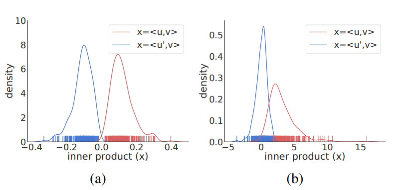 锚点/正嵌入和锚点/负嵌入(GCN 对比设置)之间的点积密度得分 (红色和蓝色曲线)。左图/右图使用在 Cora 上采样的两个不同的小批量。由于分布重叠很小,许多依赖 JS 散度的对比方法可能表现不佳