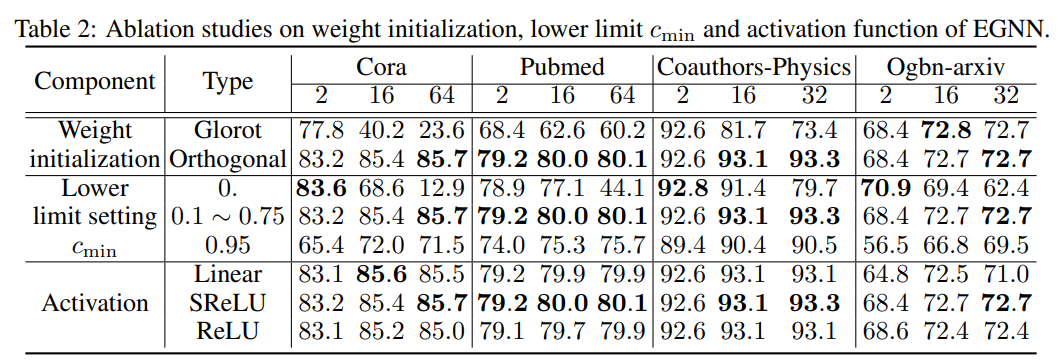 (2)作者设计了一种新颖的深度架构——能量图神经网络 (EGNN)。它遵循所提出的原理,可以有效地学习最佳狄利克雷能量。它由三个组件组成,即正交权重控制、下界残差连接和移位 ReLU (SReLU) 激活。图卷积层的可训练权重正交初始化为对角矩阵,其对角线值经过正则化以满足能量上限并消除过度分离。剩余连接强度由能量下限决定,以避免过度平滑。虽然广泛使用的 ReLU 激活导致 Dirichlet 能量的额外损失,但线性映射恶化了 GNN 的学习能力。我们将 SReLU 与可训练的转变一起应用,以在非线性和线性映射之间进行权衡