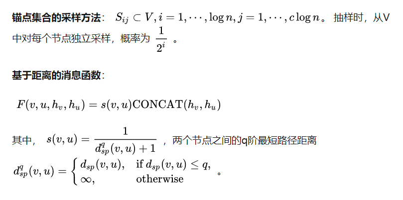 作者利用Bourgain Theorem,借助锚点集合的方式,可以从理论上保证空间的弯曲度(distortion)在一定的程度内。从使用锚点集合来作为图上的相对位置的基点,在计算节点的Embedding时融合距离信息,从而学习到带有位置信息的Embedding。