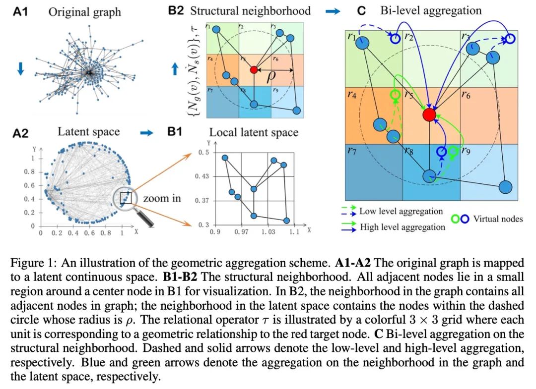 (4)Bi-level聚合:在两个近邻关系里分别聚合,聚合到虚拟节点上,然后再把虚拟节点上的信息做聚合得到节点的Embedding表示。