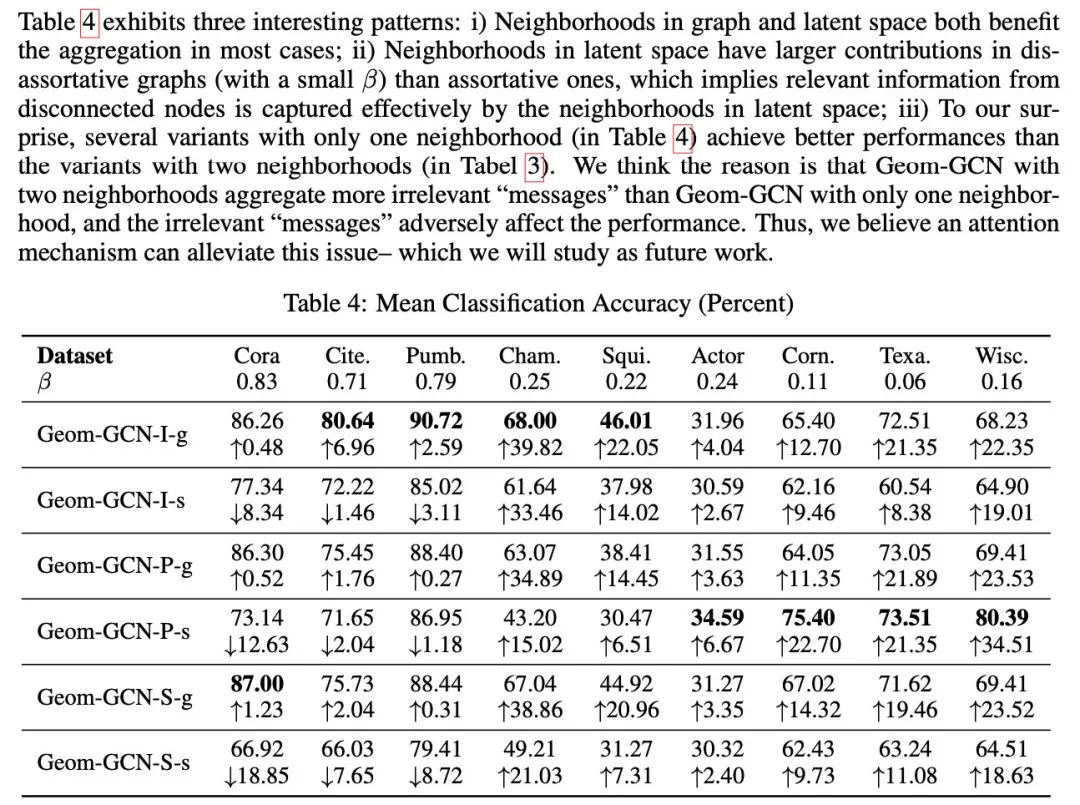 另外,作者使用邻居节点的label的相同比例来度量同质性(下表中的beta),发现在同质性较低的网络上,GEOM-GCN的提升效果更明显。
