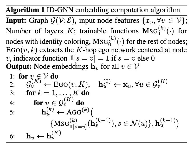 ID-GNN的核心点就是计算节点的Embedding时,针对中心节点和周围节点使用不同的消息函数。