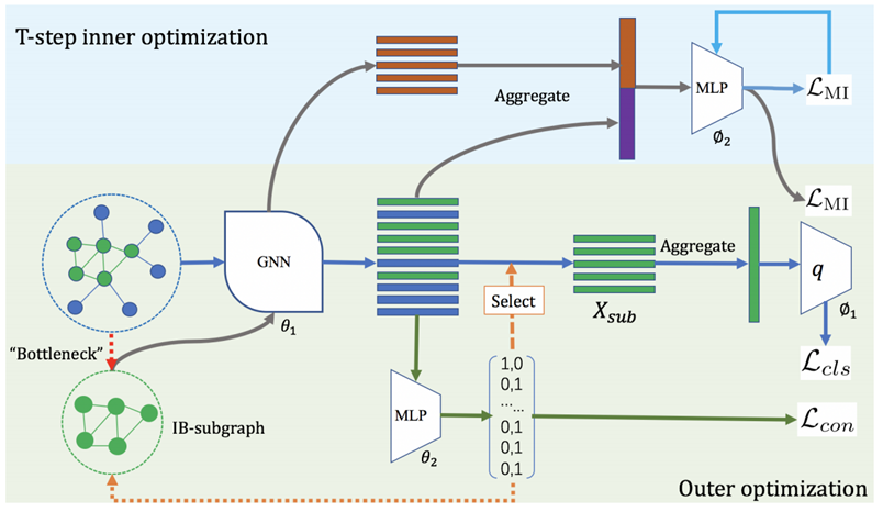 图卷积网络(GCN)的出现极大地推动了图学习的进步。然而,图数据中的噪声和冗余以及预测结果的可解释性差阻碍了GCN的进一步发展。受信息瓶颈(IB)原则的启发,本文提出了一种新颖的子图信息瓶颈(SIB)框架来识别此类子图,称为 IB-subgraph。由于互信息难通常难以处理且图数据往往具有离散性,难以对SIB 的目标函数进行优化。为解决此问题,文中结合不规则图的互信息估计器引入了一种双层优化方案。此外,在connectivity loss中选择子图部分采用连续松弛,从而提高模型的稳定性。文章从理论上证明了互信息估计方案的误差界限和 IB 子图的噪声不变性。