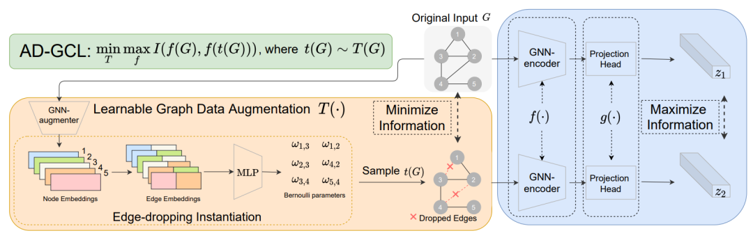 图对比学习 (GCL) 通过最大化相同图在不同增强形式中表示之间的对应关系,能够在无标签的情况下训练得到稳健且可转移的GNN。然而,由传统 GCL 训练的GNN容易提取出冗余的图特征,降低模型的鲁棒性且严重阻碍特征应用在下游任务上的效果。针对这些问题,本文提出了一种新的原则,称为对抗性GCL (AD-GCL),它使GNN 能够通过优化 GCL 中使用的对抗性图增强策略来避免在训练期间捕获冗余信息。文中通过理论分析解释AD-GCL原则,并基于AD-GCL实例化了一个可训练的edge-dropping图增强模型。通过与SOTA图对比学习方法比较,AD-GCL在无监督学习、转移、和半监督学习中分别实现了14%,6% 和3%的性能提升。