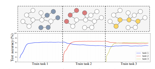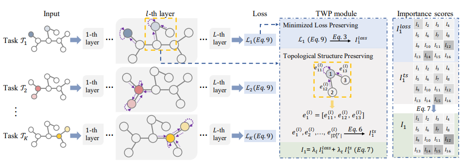 灾难性遗忘是指神经网络在学习新任务时会“忘记”先前学习的知识的趋势。在本文中,作者提出了一种新的方案,致力于克服灾难性的遗忘问题,从而加强GNN中的持续学习。方法的核心是一个通用模块,称为拓扑感知权重保持(TWP),以即插即用的方式适用于任意形式的GNN。与基于CNN的持续学习方法的仅依赖于减慢对下游任务重要的参数的更新不同,TWP明确地探索输入图的局部结构,并试图稳定在拓扑中起关键作用的参数。本文在几个数据集中的不同GNN主干上评估了TWP,并证明了它产生的性能优于最新技术。