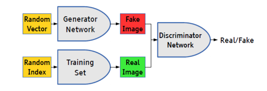 例如我们现在的数据集是手写数字数据集minst,生成模型的输入可以是二维高斯模型中一个随机的向量,生成模型的输出是一张伪造的 fake image,同时通过索引获取数据集中的真实手写数字图片real image,然后将 fakeimage 和 real image 一同传给判别模型,由判别模型给出 real 还是fake 的判别结果。于是,一个简单的 GANs 模型就搭建好了。值得注意的是,生成模型G和判别模型D可以是各种各样的神经网络,对抗网络的生成模型和判别模型没有任何限制。