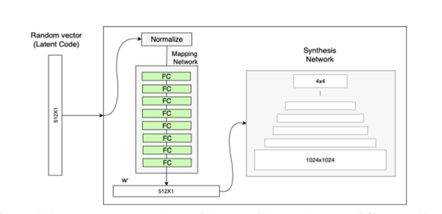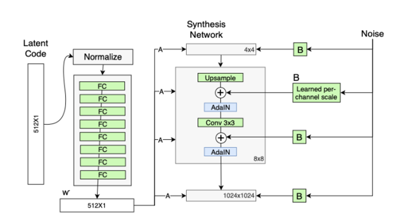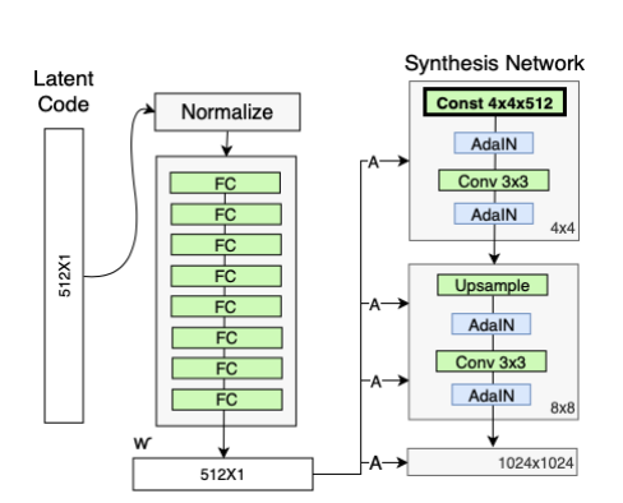 StyleGAN的第一点改进是,给生成器的输入加上了由8个全连接层组成的映射网络,映射网络的输出𝑊′与输入层(512×1)的大小相同。添加映射网络的目标是将输入向量编码为中间向量,并且中间向量后续会传给生成网络得到18 个控制向量,使得该控制向量的不同元素能够控制不同的视觉特征。