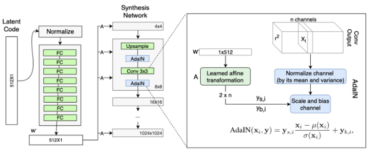 其中 AdaIN的具体实现过程如上右图所示:将𝑊′通过一个可学习的仿射变换(A,实际上是一个全连接层)扩变为放缩因子y𝑠,𝑖与偏差因子y𝑏,𝑖,这两个因子会与标准化之后的卷积输出做一个加权求和,就完成了一次𝑊′影响原始输出x𝑖的过程。而这种影响方式能够实现样式控制,主要是因为它让𝑊′(即变换后的y𝑠,𝑖与y𝑏,𝑖)影响图片的全局信息(注意标准化抹去了对图片局部信息的可见性),而保留生成人脸的关键信息由上采样层和卷积层来决定,因此𝑊′只能够影响到图片的样式信息。