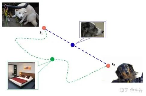 我们假设把每一个图片看作二维空间中的一个点,并且现有图片会满足于某个数据分布。以人脸举例,在很大的一个图像分布空间中,实际上只有很小一部分的区域是人脸图像。如上图所示,只有在蓝色区域采样出的点才会看起来像人脸,而在蓝色区域以外的区域采样出的点就不是人脸。我们需要做的,就是让机器去找到人脸的分布函数。具体来说,就是我们会有很多人脸图片数据,我们观测这些数据的分布,大致能猜测到哪些区域出现人脸图片数据的概率比较高,但是如果让我们找出一个具体的定义式,去给明这些人脸图片数据的分布规律,我们是没有办法做到的。但是如今,我们有了机器学习,就可以通过机器去学习到这样一个分布规律,并能够给出一个极致贴合的表达式。