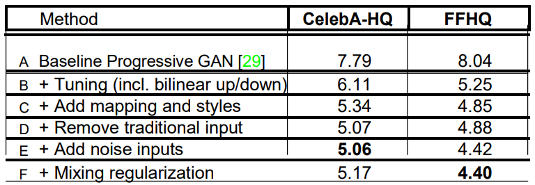 各种生成器设计的 Frechet'起始距离(FID)(越低越好)。在本文中,我们使用从训练集中随机抽取的 50,000 张图像来计算FID,并报告在训练过程中遇到的最低距离。